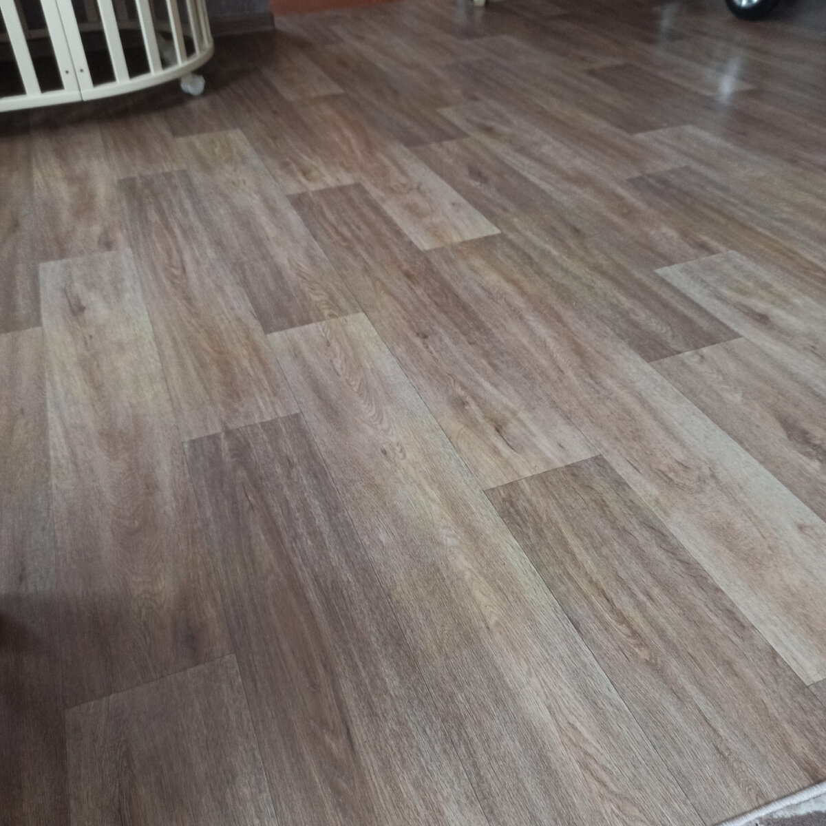 Однако вскоре произошло нечто непредвиденное: глянцевая поверхность линолеума начала менять цвет. Сначала это были едва заметные пятна, но со временем изменение цвета стало проявляться всё сильнее и распространилось по всей площади комнаты. Важно отметить, что комната очень солнечная, и покрытие долгое время находилось под воздействием прямых солнечных лучей.