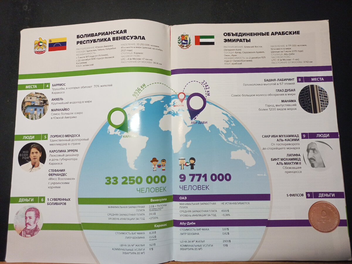 Например, журнал «Деньги мира» делится с читателями сведениями об особенностях жизни в зарубежных странах и предоставляет любителям нумизматики иностранные деньги. В комплект издания вложена в прозрачном пакетике настоящая валюта другого государства.