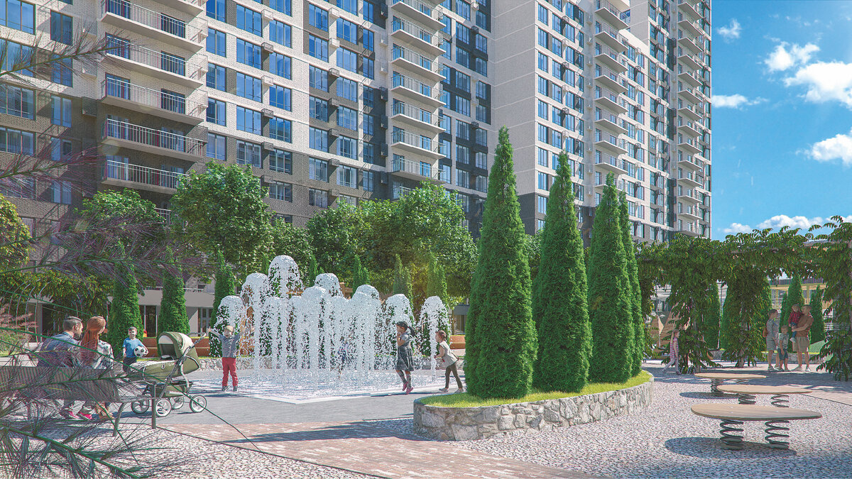 Функциональную часть двора мы сделали максимально детской и семейной, наполнив ее игровыми площадками различной тематики, качелями, аллеями и лужайками, арт-объектами, лаундж-зонами, а также разместили фонтан и водный объект.