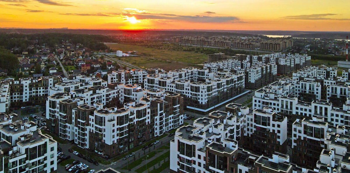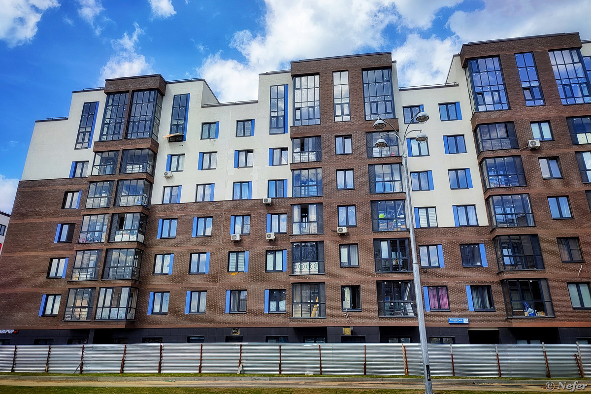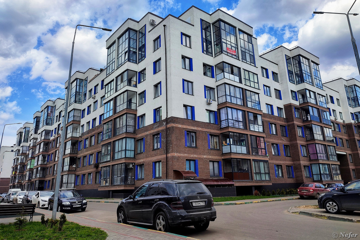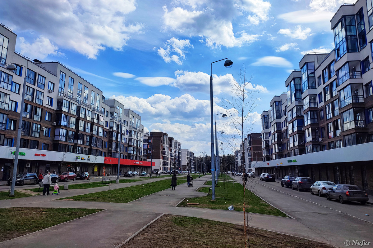 Комплекс состоит из среднеэтажных корпусов. Народу там достаточно много, ходят, гуляют. Многие делают ремонт, балконы завалены стройматериалами, а около магазинов рабочие предлагают свои услуги. Архитектура не пугает настолько, как ПИКовские человейники, но все же достаточно скучная и однообразная. Из положительных моментов можно отметить большие панорамные окна.