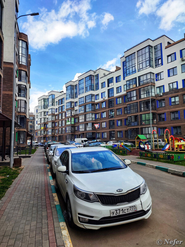 Погуляли между домов, посмотрели, заглянули во двор. Я сделала несколько фотографий. Потом стала листать отснятые кадры, ощущение, будто я фотографировала один и тот же дом с разных сторон. Но нет, это все разные корпуса. Позже я научилась их различать: один с синей полоской, другой - с красной, третий - с желтой. На сайте застройщика это называется "изящные фасады с яркими деталями, создающими уютную атмосферу".
