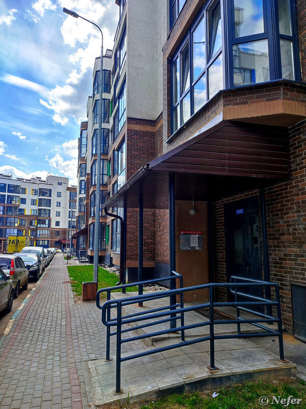 Продолжение жилого комплекса, почему-то за забором. То есть с этой стороны туда пройти нельзя, только в обход. Логику не уловила. Зато здесь можно рассмотреть верхние этажи. Там расположены двухуровневые квартиры со "вторым светом". Высота потолков - 5,85 метра.