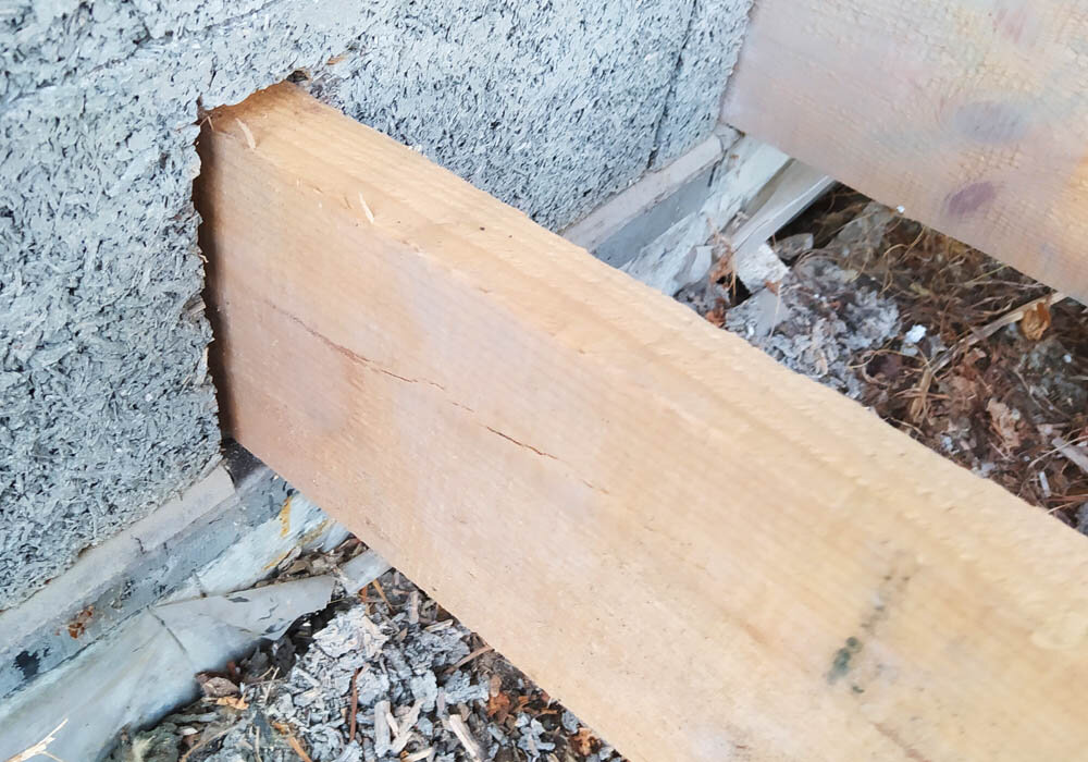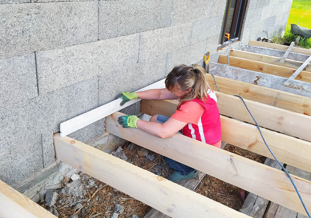 Вооружился болгаркой и потратил пару часов на вырезание ниш в стене из арболита. Напилил и установил все 15 балок. Со стороны дома они в нишах и сдвинутся не могут, с противоположной — связал временной доской. Строго по разметке.