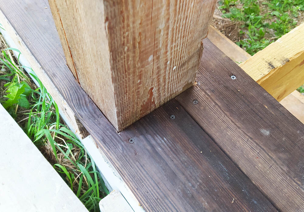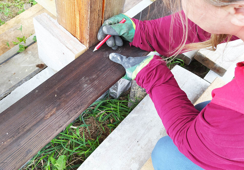 Скажу я вам — задача не из самых простых. Прикладывали каждую доску по месту и Главный Архитектор тщательно отмечала на ней положение каждого из столбиков, а затем обрисовывала выемку, которую нужно выпилить. А я уже выпиливал и дорабатывал стамеской. Затем примерял на место, снимал и ещё раз дорабатывал. Пока не получалось идеального совпадения.