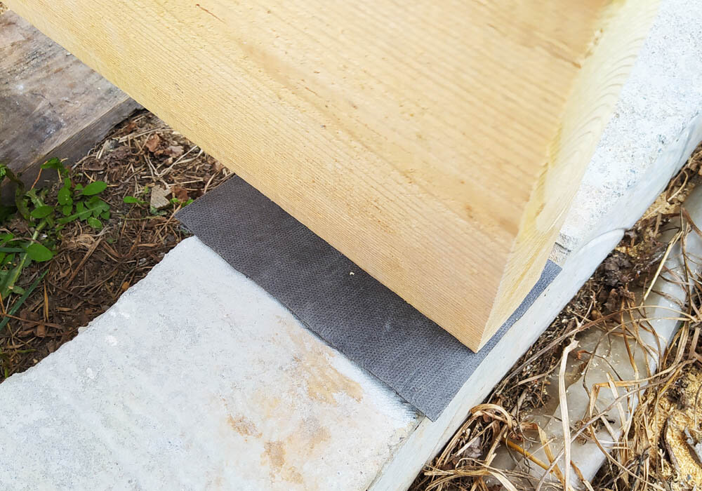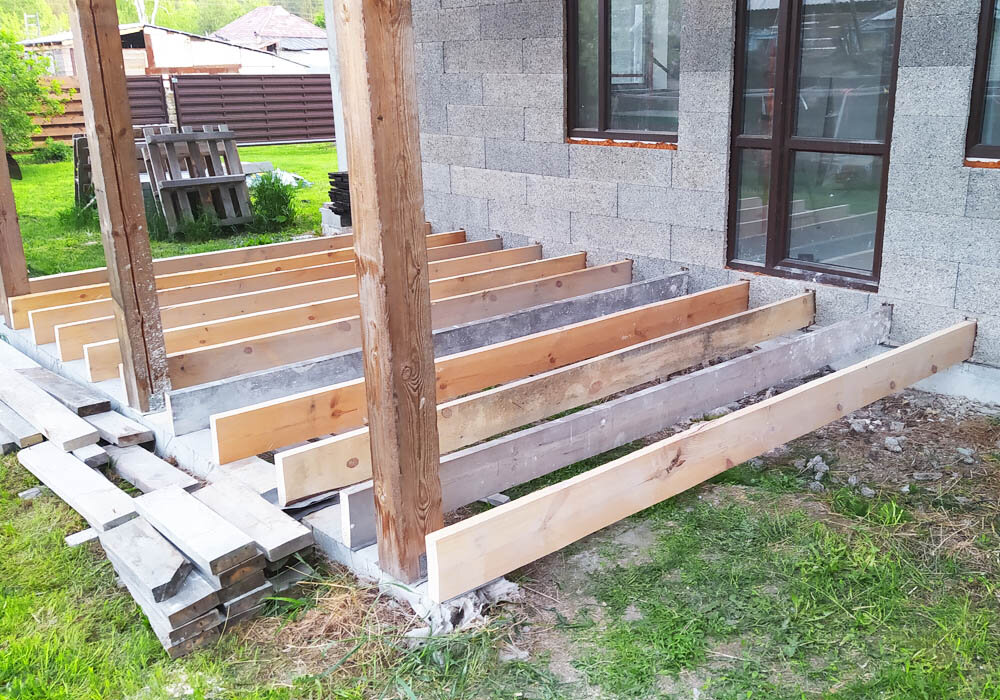 Работу по сооружению террасы мы начали с установки несущих балок, их ещё называют лагами. Получилось 15 штук. Каждая длиной 354 сантиметра. Изготовили из так называемых "стропильных досок", 50 на 200. С одной стороны они опираются на специально сооружённый фундамент, с другой — на фундамент дома и вставлены в "выдолбленные" в стене дома ниши.