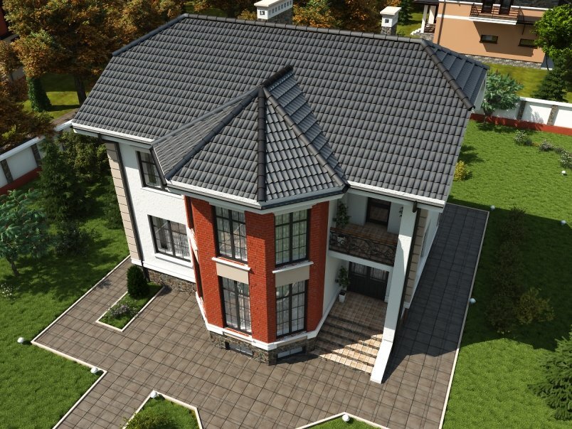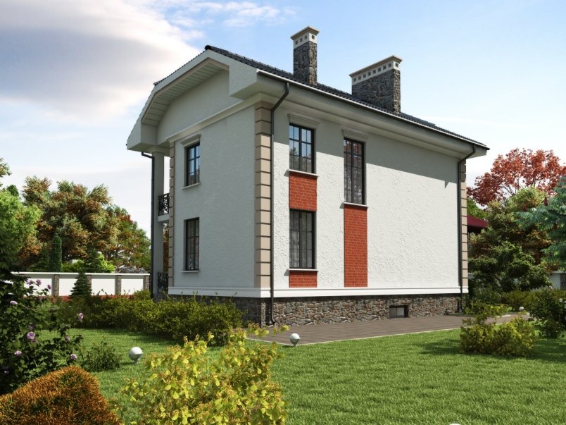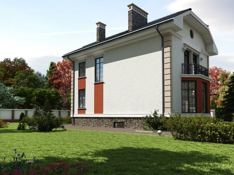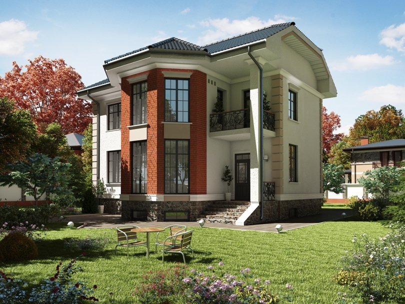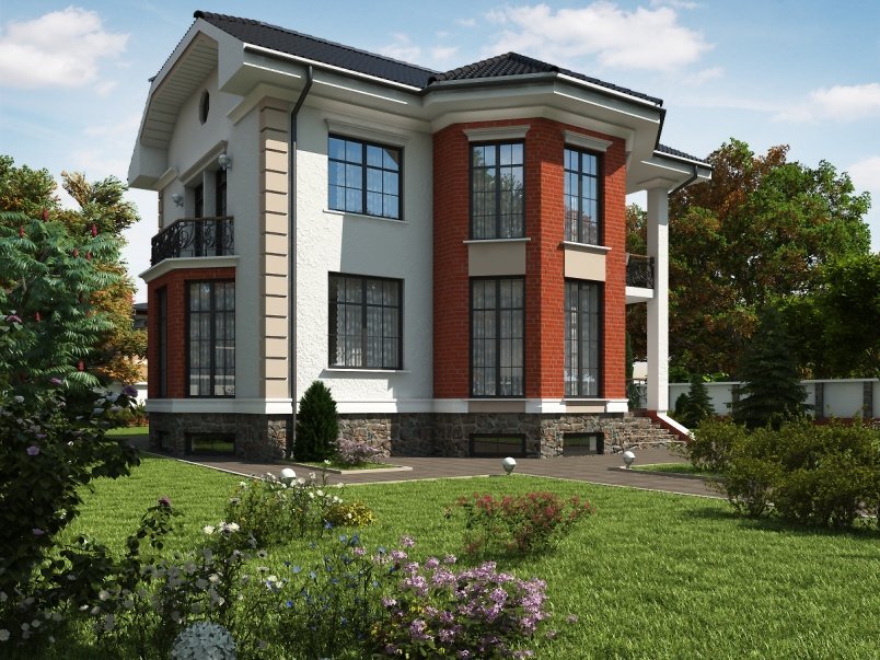 Классическая архитектура никогда не теряет своей актуальности. А прекрасный двухэтажном коттедж «Назар» подтверждение этому. Краснокирпичные эркеры, колонны и кованные ограждения балконов придают образу изысканность эстетики.