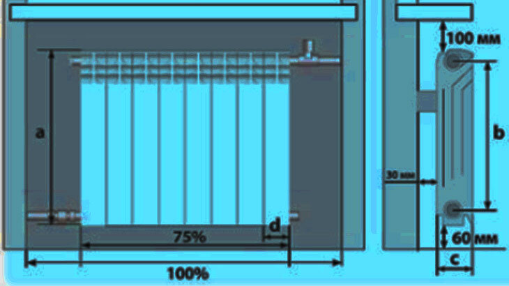 От стены до радиатора расстояние должно быть 25-30 мм. Не всегда рекомендуемые размеры по установке отопительных приборов можно выдержать. Дело в том, что в серийных домах высота потолков и размер окон разный, не говоря уж об индивидуальных строениях, построенных под заказ.