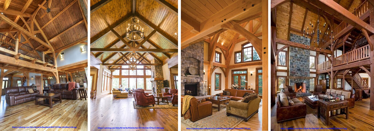 Конечно же стоит уделить внимание отделке деревянных ферм, а также сток и балок каркаса, которые со стороны помещения полностью открыты для обозрения, что уже само по себе придаёт интерьеру брутальность и своеобразный шарм. Так вот, заказчик имеет возможность выбрать «декор» поверхности деревянного каркаса: пилёную, строганую, состаренную («патина») или покрытую насечкой (наносится вручную с помощью топора), с декоративной резьбой и т. п. Что касается отделки стен, точнее проёмов между элементами каркаса, то здесь можно применять гипсокартон под окраску, покрытие фактурной штукатуркой, облицовку плиткой (в том числе под кирпич и природный камень) или панелями, а также деревянную обшивку, тонируемую в выбранный пользователем цвет. В результате помещения можно оформить практически в любом стиле — от классического до самого современного.